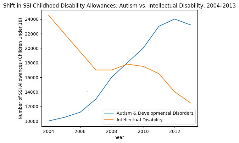 My essay, Unraveling Autism’s Surge: Genetics, Environment, and the Expanding Diagnostic Net, examined the data behind the dramatic rise in autism diagnoses and highlighted institutional incentives. One clear pattern is diagnostic substitution: federal SSI childhood disability allowances for autism and related developmental disorders rose sharply between 2004 and 2013, while allowances for intellectual disability fell by almost the same magnitude. The shift suggests reclassification rather than a sudden biological epidemic.
