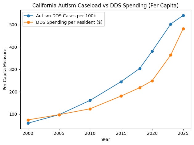 When normalized for population, California’s Department of Developmental Services’ autism-related -caseload and -spending (per resident) has climbed tenfold(!).