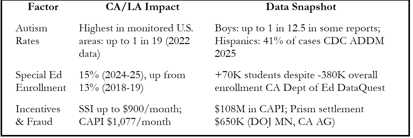 Autism diagnoses have surged dramatically, but the increase largely reflects diagnostic reclassification (autism rising on SSI records as intellectual disability falls), broader criteria, and institutional incentives—not a sudden biological epidemic. California stands out: prevalence reaches up to roughly 1 in 19 in some areas (well above the national average), its developmental services caseload has ballooned, and special education enrollment has climbed even as overall student numbers dropped, creating persistent staffing shortages. I coined “fraudtism” to describe how financial rewards—disability payments, special education funding, and state programs—can encourage diagnostic inflation, especially in immigrant-dense, low-income districts. Overt fraud appears in Minnesota Medicaid kickback scandals, while subtler pressures ‘medicalize’ poverty and expand bureaucracies nationwide. A rational fix requires clearer classification (profound vs. mild), cross-cultural audits, and incentives realigned toward targeted recovery rather than endless caseload growth.
