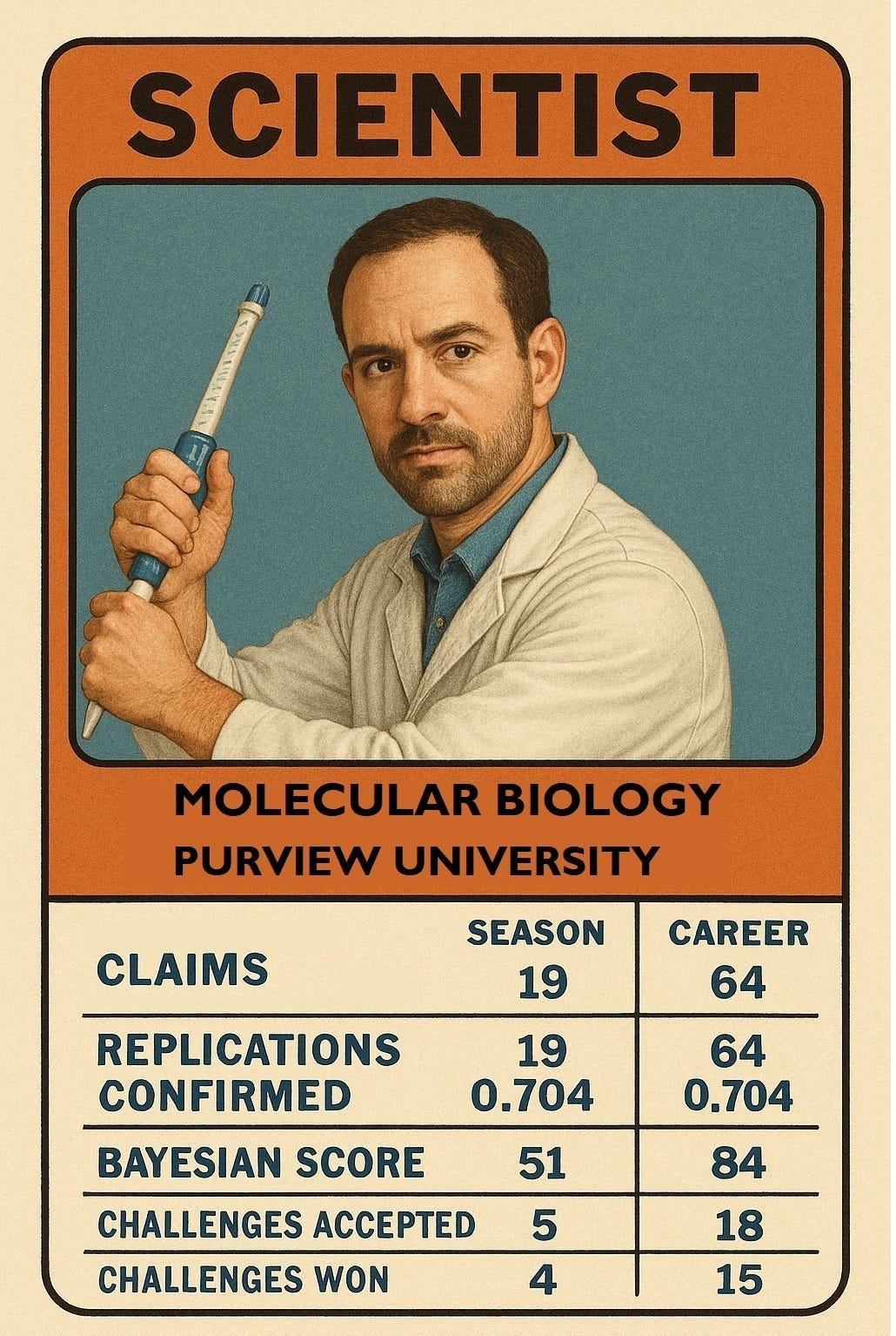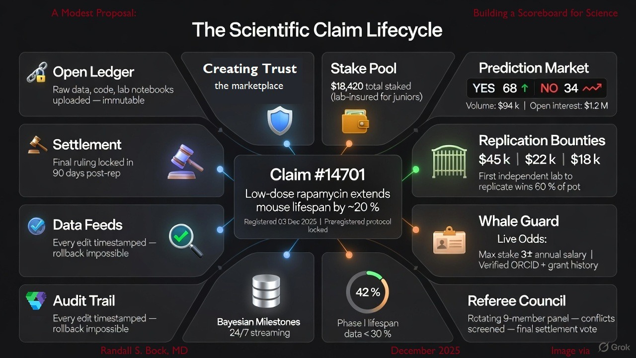 A scientist registers a claim and puts $800 of lab-insured skin in the game. Within weeks, the raw data is public; prediction markets are pricing the odds of replication; and rival labs are bidding on bounty contracts to test it. A year later, the independent referee council settles the final score using pre-agreed rules. The winners cash out, the losers pay, and every career résumé now carries a public batting average that no dean or editor can fake.