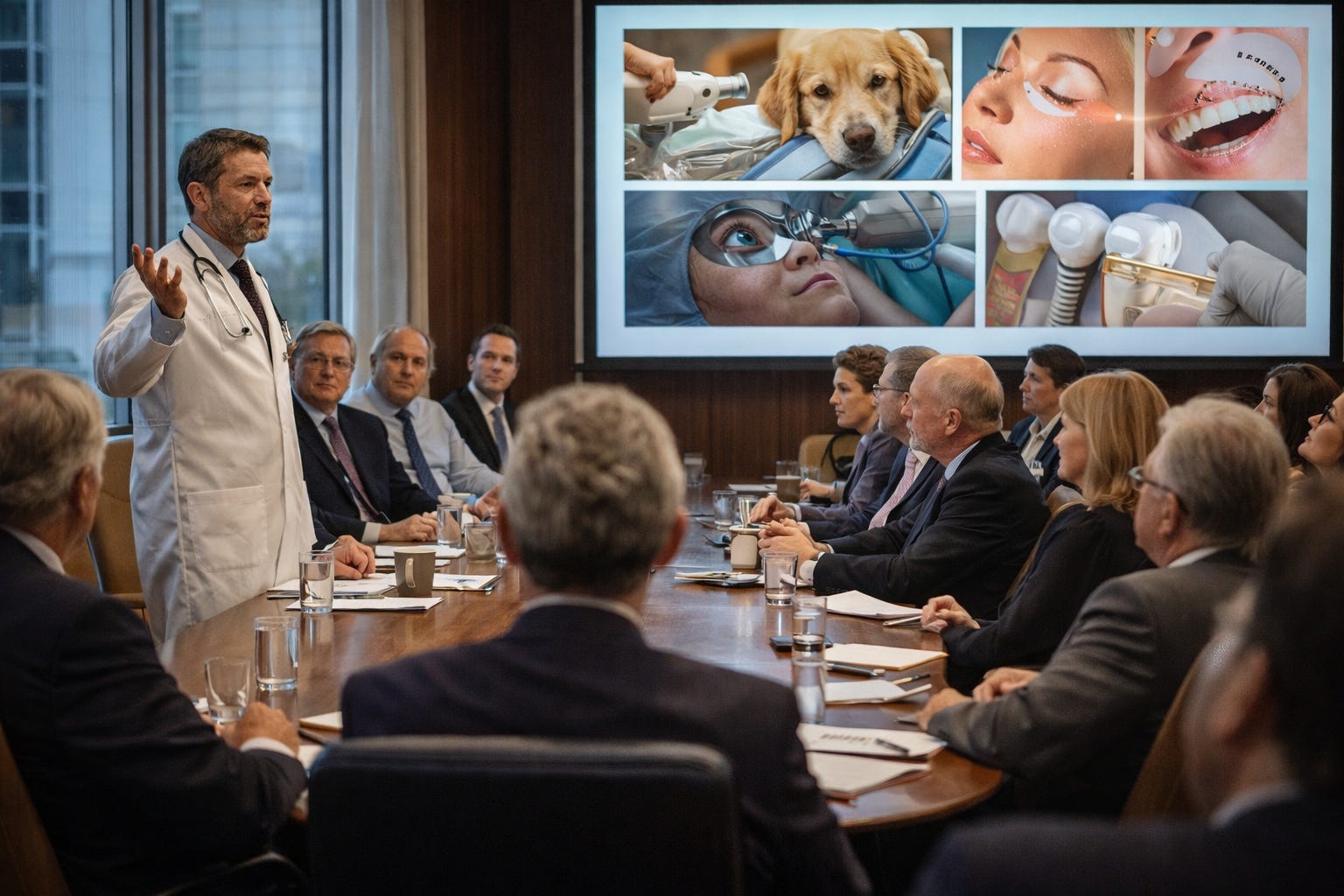 “I ‘forgot’ to mention. I’m talking about veterinary orthopedics, laser cosmetic procedures, LASIK eye surgery, and dental implants.”