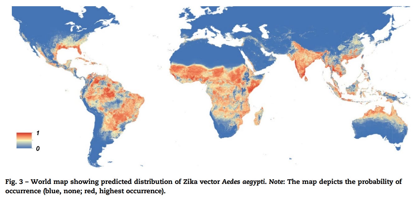 For reference, look back at the heyday of Zika frenzy in April 2016, when experts’ modeling warned of one million additional, annual microcephalic births– globally, given Aedes aegypti- / dengue- (thus Zika-) / tropics- confluence. The global footprint of CZS has failed to materialize despite widespread vector presence-- undermining both the original claims and their lingering justifications.