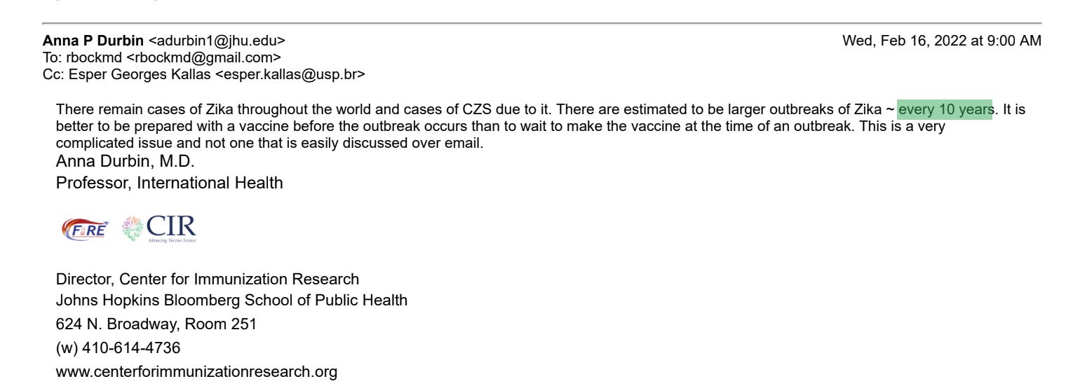 Did her better half, Dr. Fauci, listen? Perhaps temporarily, but with Zika Microcephaly’s “failure to thrive” as a disease-concept, there were vast amounts of the $450 million allocated in 2016 unspent. By 2018, NIAID’s Dr. Fauci (et al.) offered Brazil $110 million to host an HCT. Brazil declined. The outbreak had already vanished. That should have ended it. Instead, the effort was quietly rerouted to Baltimore’s Johns Hopkins’ Bloomberg School of Public Health, where Dr. Anna Durbin pushes forward, baselessly suggesting that Zika may return in 10-year cycles—
